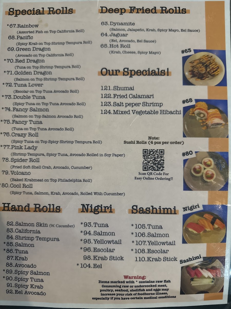 “ The good. This is a super cool place because of the robot sushi rolls were very nommy. The hibachi was really good. I loved being served by a robot it was super fun. The ice cream was good! The crab fried sticks were so good. The staff was friendly. The presentation of the food was good. I love the green dragon. The miso soup was good. All of the food was so good!! The only things I would do is change the atmosphere a bit. Thank you for the experience. The decor seems a little lacking I was hoping to get a nice picture and it seemed like the remnants of Christmas decor were all that were up. with everyone around you very hurried and rushed kind of chaotic. It was like a fast flowing buffet line with table service. The betterments needed. It's a little disorganized and it was our first time so we didn't know how to order. You use little slips of paper and write down the number you want. Seems a little weird. The waitress was a young girl that seemed really overwhelmed. It definitely can use a little better cleaning before and after and the slips of paper and reused pens seem unclean. Soy sauce and bowls for that on the table had stuff stuck to them. Definitely needs some better lighting and prettier decor. They didn't have the outdoor seating open It seemed like they were having a staff meeting Better instructions for how to order your food. Or maybe even a tablet to order on maybe. For 80 it was pricey. Definitely not a regular occasion kinda place The ice cream comes with no utensil. You definitely need a metal spoon it's gelatin and the plastic flimsy one didn't separate the pieces. I also checked the box for Ginger and didn't receive it. Need to wipe down the robot screen it was greasy smeary. And I think just a dedicated wiper would be needed because of how much travels around! A lot of lack of cleaning ”